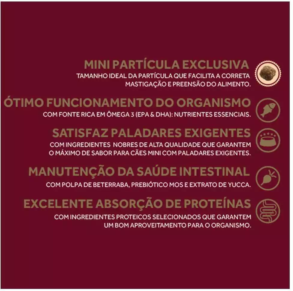 - Satisfaz paladares exigentes, com ingredientes nobres de alta qualidade que proporcionam uma experiência de sabor para cães mini com paladares exigentes;