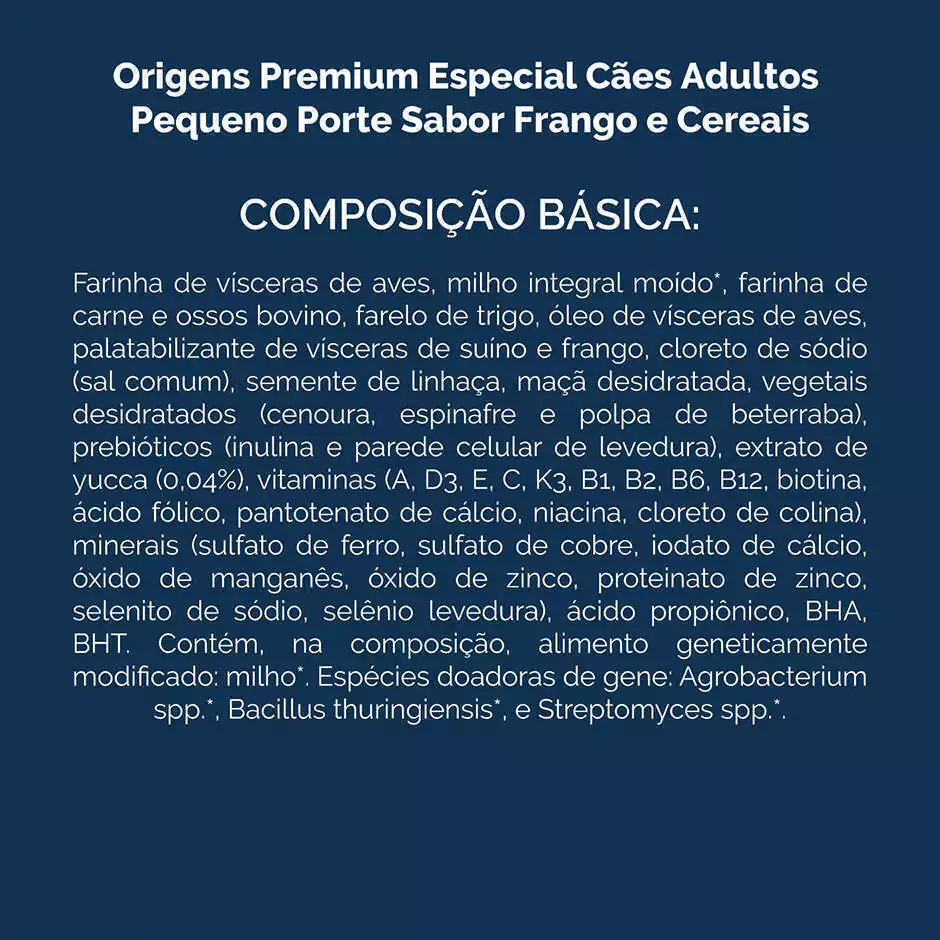 Farinha de vísceras de aves, milho integral moído*, farinha de carne e ossos bovino, farelo de trigo, óleo de vísceras de aves, palatabilizante de vísceras de suíno e frango, cloreto de sódio (sal comum), semente de linhaça, maçã desidratada, vegetais desidratados (cenoura, espinafre e polpa de beterraba), prebióticos (inulina e parede celular de levedura), extrato de yucca (0,04%), vitaminas (A, D3, E, C, K3, B1, B2, B6, B12, biotina, ácido fólico, pantotenato de cálcio, niacina, cloreto de colina), minerais (sulfato de ferro, sulfato de cobre, iodato de cálcio, óxido de manganês, óxido de zinco, proteinato de zinco, selenito de sódio, selênio levedura), ácido propiônico, BHA, BHT.
